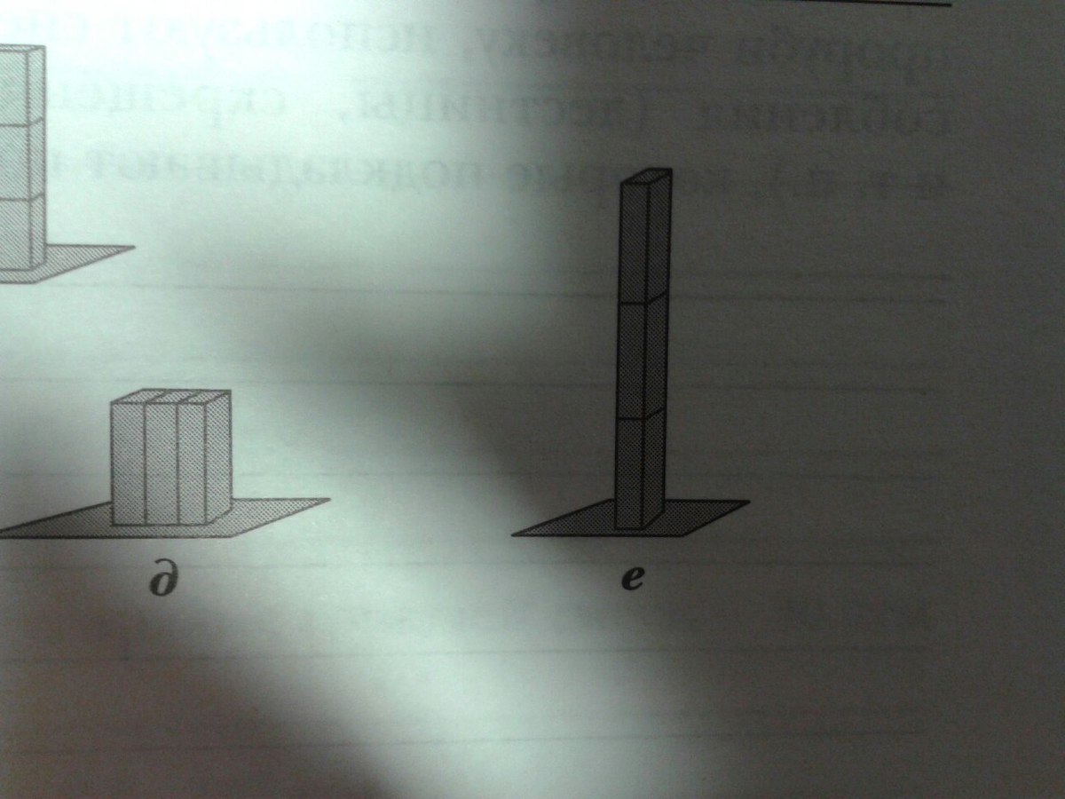 Определите давление, которое оказывают на опору три одинаковых кирпича массой по 5 кг каждый, в случаях изображённых на рисунках "д" и "е" ( рисунки прикреплены ниже) Размеры кирпичей 20 см*10 см*5 см.