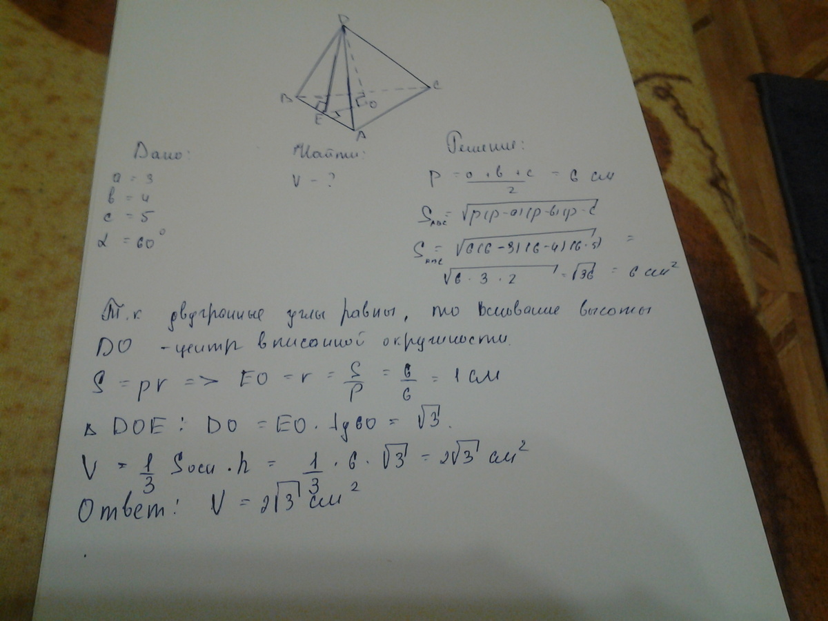 Найдите объем треугольной пирамиды, в основании которой лежит треугольник со сторонами 3,4 и 5, а двугранные углы при основании 60 градусов