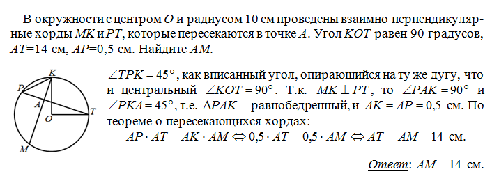 В окружности с центром О и радиусом 10 см проведены взаимно перпендикулярные хорды МК и РТ,которые пересекаются в точке А. Угол КОТ равен 90 градусов,