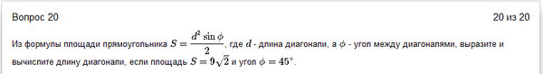 a- угол между диагоналями. d- длина диагонали. S- площадь прямоугольника. sqrt(a)- корень квадратный из a.