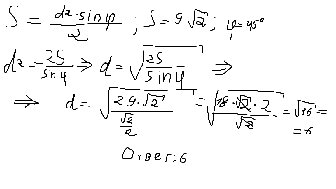 S= (d^2*sina)/2 => d^2 = (2S)/sina => d= sqrt((2S)/sina) =>