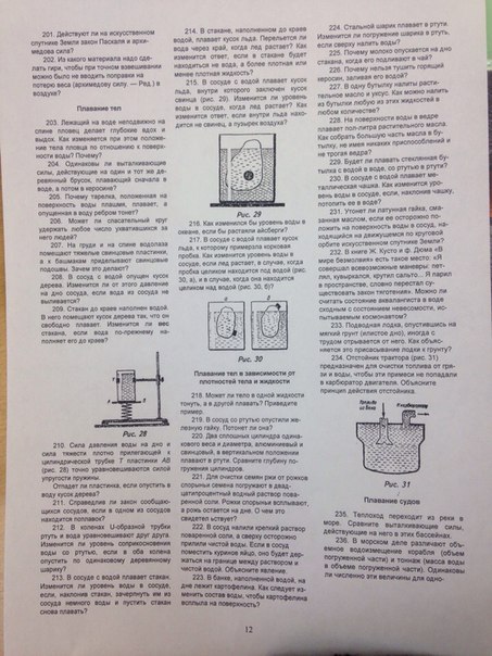 214вес льда=весу вытесненной воды, когда он растает,его вес не изменится полученная вода займет его место, вода не перельется, если жидкость меньшей плотности, лед утонет, а когда растает, жидкость точно не перельется, а если в ртути, лед будет почти весь наруже и когда растает, образовавшаяся вода стечет почти вся.///////// 216. связано с 214. образовавшаяся вода из погруженной части айсберга меньше льда по объему, но есть и надводная часть, она тоже даст воду, см 214.///////218 картошка тонет в воде, но плавает в сильно соленой.///////219. нет, ее плотность меньше.//////////220. алюминевый менее погружен из-за малой плотности./////////221. плотность ржи больше плотности соленой воды, а рожков меньше.