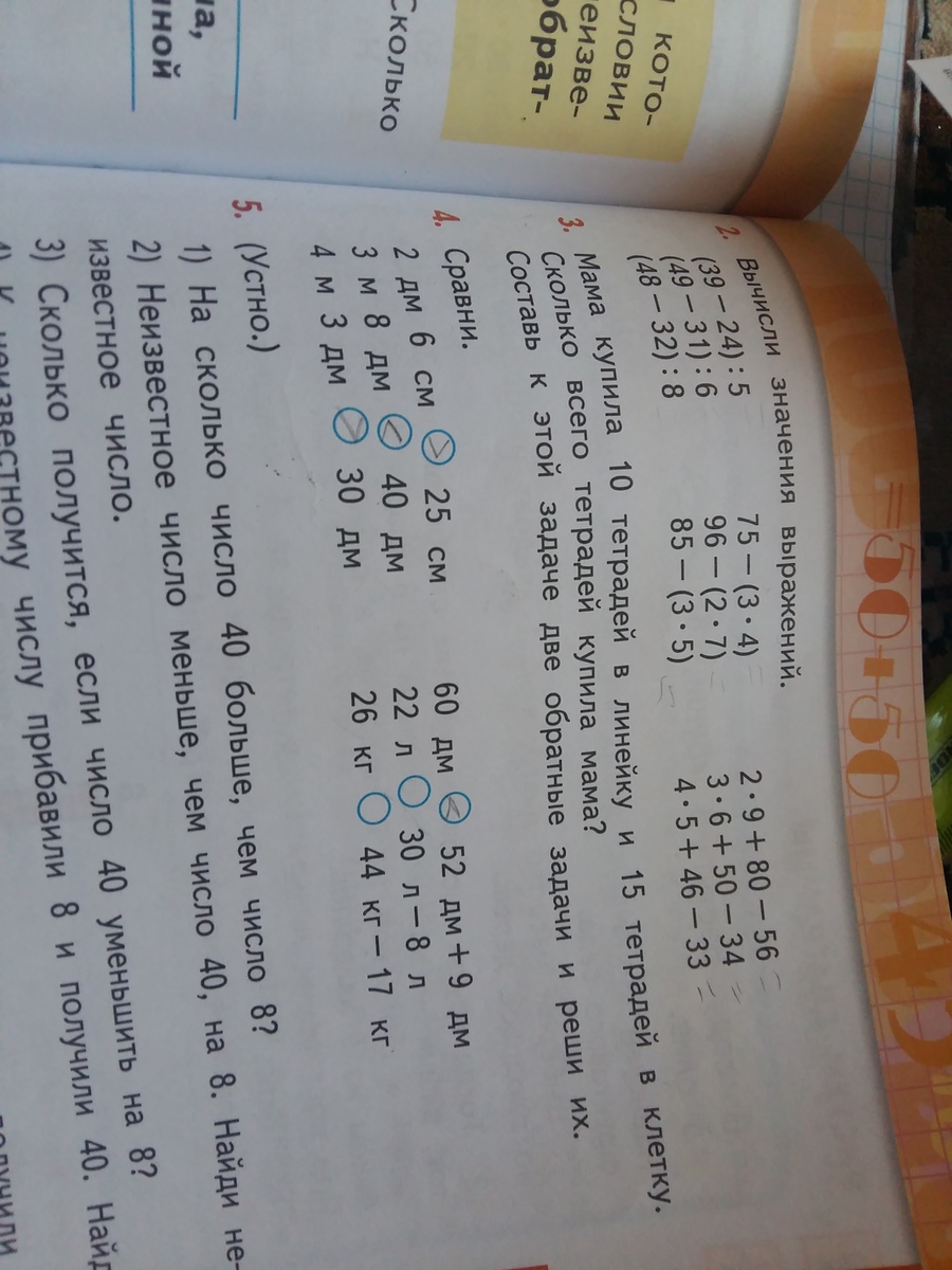 Вторая обратная: Всего мама купила 25 тетрадей. Из них было 10 в линейку. Сколько мама купила тетрадей в клетку?