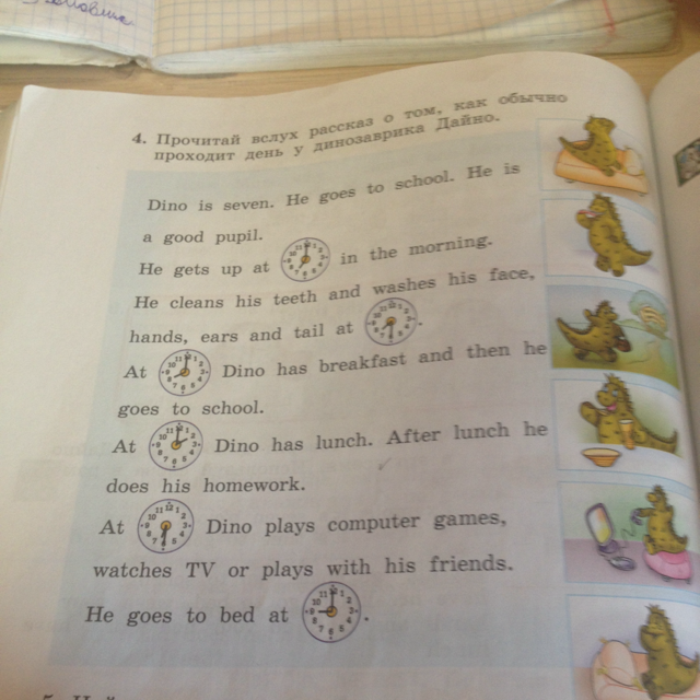 Дино 7 лет. Он ходит в школу. Он хороший ученик . он встаёт в семь часов утром. Он чистит зубы и умывает лицо до семи тридцати . В восемь он завтракает и идёт в школу. в два у Дино обед .после обеда он делает домашнее задание . в 6 Дино играет в компьютерные игры, смотрит телевизор и играет с друзьями . в 9 он идёт спать