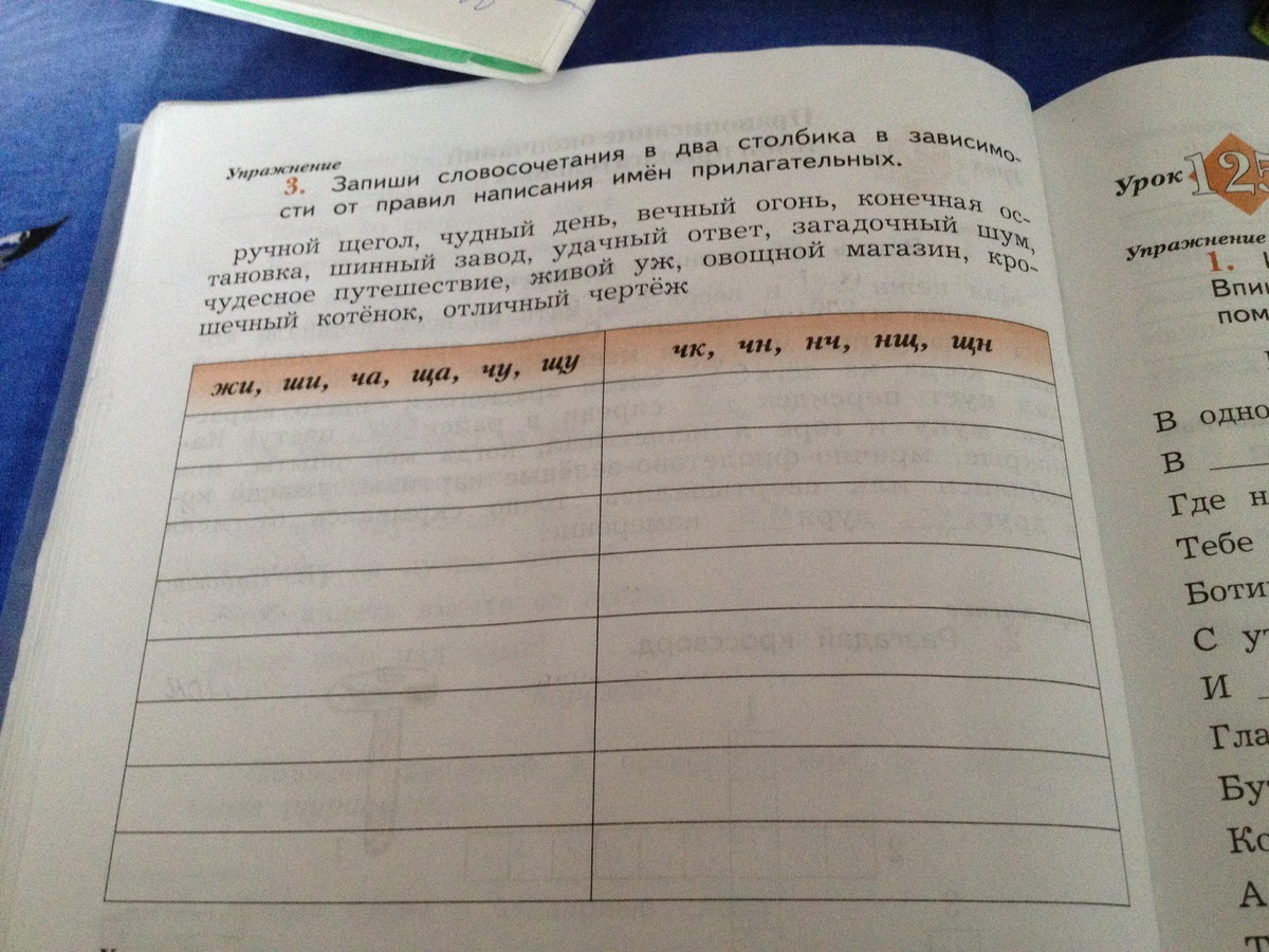 Запиши словосочетания в два столбика в зависимости от правил написания имён прилагательных.