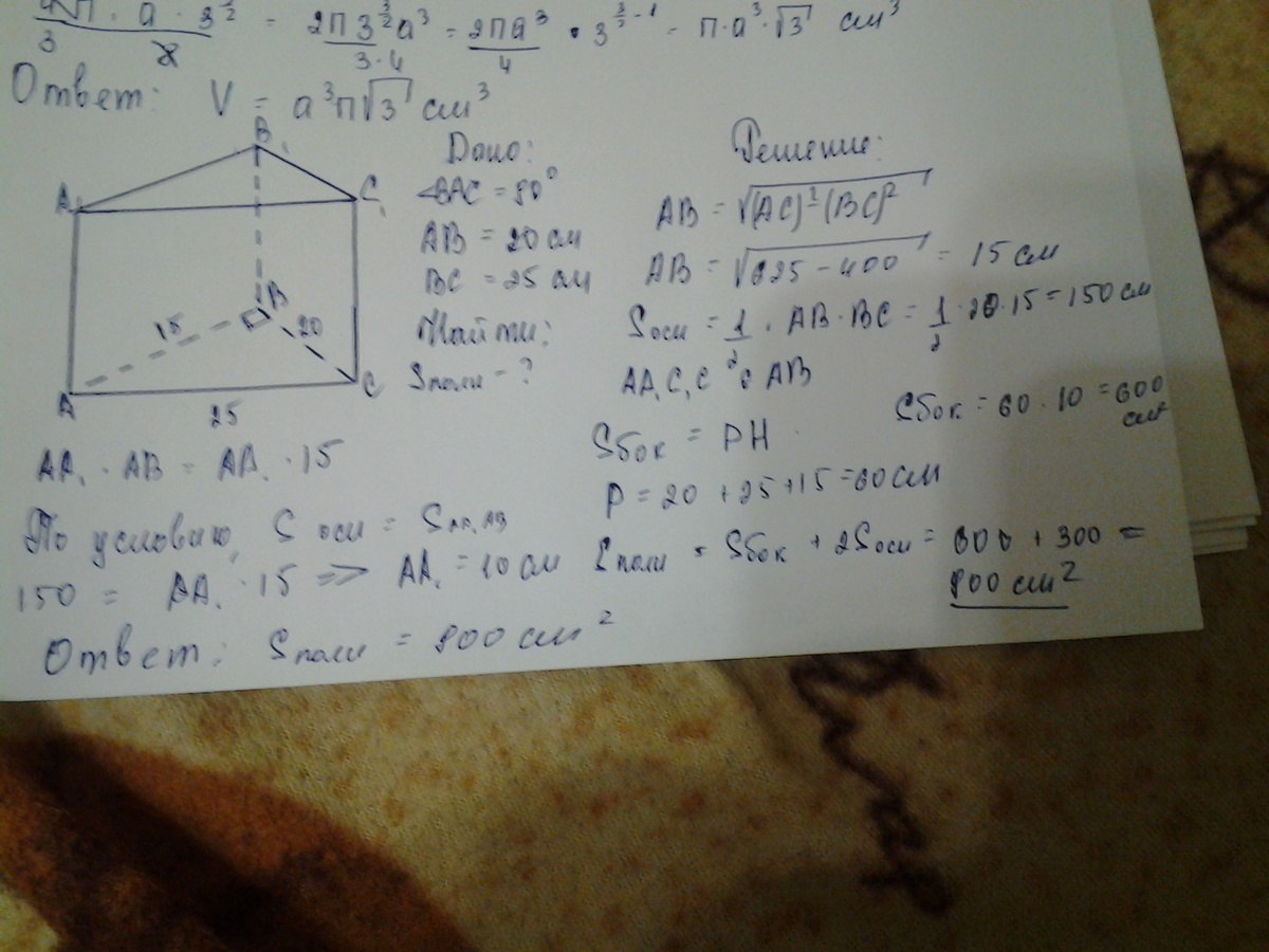 Основание прямой призмы - прямоугольный треугольник с гипотенузой 25 см и катетом 20 см. Меньшая боковая грань и основание призмы одинаковы. Найдите площадь боковой и полной поверхности призмы.