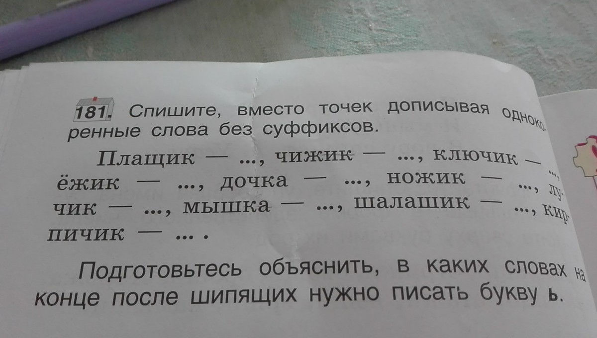 Плащик - плащ , чижик - чиж, ключик - ключ , ёжик - ёж , дочка - дочь , ножик - нож , лучик - луч , мышка - мышь , шалашик - шалаш , кирпичик - кирпич