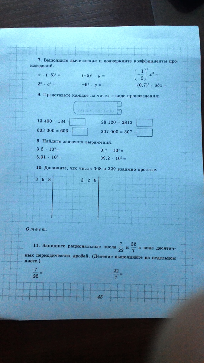 задание № 8 1)13400=134*100 2)28120=2812*10 3)603000=603*1000 4)307000=307*1000 задание №9 1)3,2*10в третей степени = 3,2*10000=32000 2)0,7*10в третей степени =0,7*10000=7000 3)5,01*10во второй степени =5,01*100=501 4)39,2*10во второй =39,2*100=3920 задание№10 368/2, 184/2 92/2 46/2 23 остаётся так как не делится на число нацело 329/7 47 остаётся как тоже не делится нацело задание№11 7/22= 0,318 22/7=3,142 это всё приблезительно равно задание№7 1)х*5в 2 степени =25х 2)2 в 3 степени*а во второй степени =8а во второй степени 3)( -6) во вторйо степени*у=36у 4) -6во второй степени*у=36у 5)-(0,7) во второй степени *авх=0,49авх 6)(-1/2) х в третей степени=-1/8х в третей степени