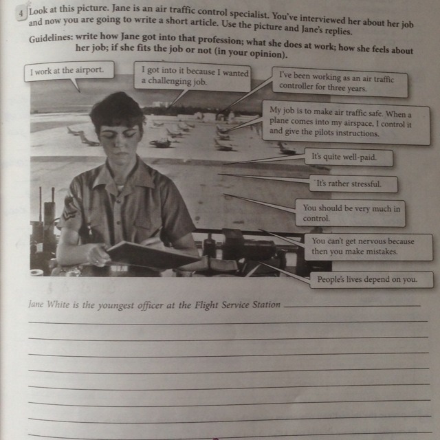 Jane White is the youngest officer at the flight service station. She want this job because it challenging. But for now she is working in airport for 3 yeas. Her job is in making air traffic safe. She gives instructions to pilots. But it is not all arguments to go for this job. It's well paid.