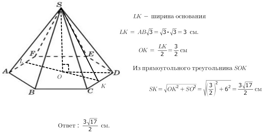 высота правильной шестиугольной пирамиды равна 2, сторона основания равна корень из 3 найдите длину апофемы этой пирамиды