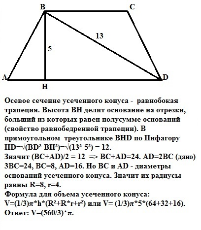 высота усеченного конуса равна 5, диагональ осевого сечения 13. радиусы оснований относятся как 1:2. найти объем конуса