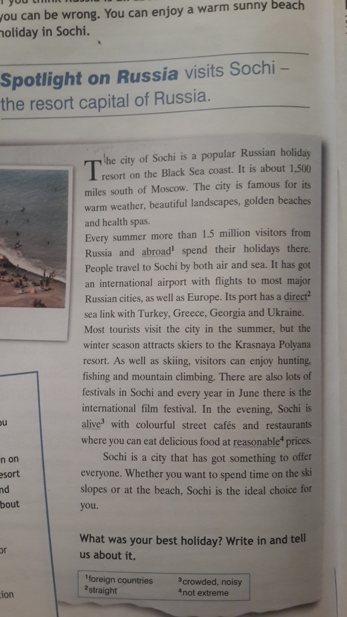 Город Сочи является популярным России курорт на побережье Черного моря. Он находится примерно в 1500 милях к югу от Москвы. Город славится своей теплой погодой, прекрасные пейзажи, золотые пляжи и курортов. Каждое лето более 15 миллионов посетителей из России, так и за рубежом проводят отпуск там. Люди путешествуют в Сочи как воздушным и морским транспортом. Она получила международный аэропорт с рейсами в большинстве крупных городов России, а также Европы. Его порт имеет прямую связь на море с Турции, Греции, Грузии и Украины. Большинство туристов посещают город летом, но зимний сезон для лыжников на курорте Красная Поляна. Помимо катания на лыжах, гости могут наслаждаться охотой. рыбалка и альпинизм. Есть также много фестивалей в Сочи, и каждый год в июне есть международный кинофестиваль. Вечером, Сочи изобилует красочными уличных кафе и ресторанов, где можно вкусно поесть по разумным ценам. Сочи это город, который имеет что-то, чтобы предложить каждому. Если вы хотите провести время на горнолыжных склонах или на пляж, Сочи является идеальным выбором для вас.