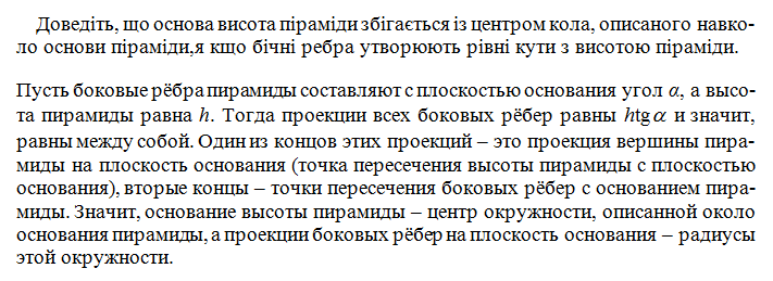 Доведіть, що основа висота піраміди збігається із центром кола, описаного навколо основи піраміди,я кщо бічні ребра утворюють рівні кути з висотою піраміди.