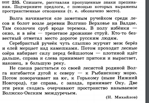 1 упр Волга начинается еле заметным ручейком среди лесов и болот возле деревни Волгино Верховье на Валдае. Там сколочен сруб вроде теремка. В полу избенки - окно, и в нем - трепетное дрожание струй.Кто-то безвестный отметил место, дорогое русским людям. Сюда часто приходят туристы с озера Селигер. Не знаменательно ли, что эту точку в глубине России они посещают заодно с двумя другими: недалеко, в деревне Руна, родилась партизанка Лиза Чайкина, а возле озера Шлино дети подобрали раненого летчика Мересьева.Серебристый ручеек чуть слышно журчит меж берез и елей, мерцает над камешками. Потом проходит лесные озера, набирает силу перед бейшлотом - плотиной, идет дальше, справа и слева принимает протоки и вырастает, наконец, в большую реку.Уже от Ржева или от Старицы в полную воду бегут в ее высоких берегах пароходики.Все лето суда могут плавать от Калинина. Не спеша расстаться со своей лесистой родиной, Волга изгибается дугой к северу - к Рыбинскому морю. Потом поворачиваетна юг к Горькому, где справа, с запада, принимает Оку. Две эти реки, сходясь, очерчивают пространство, называемое Волжско-Окским междуречьем.