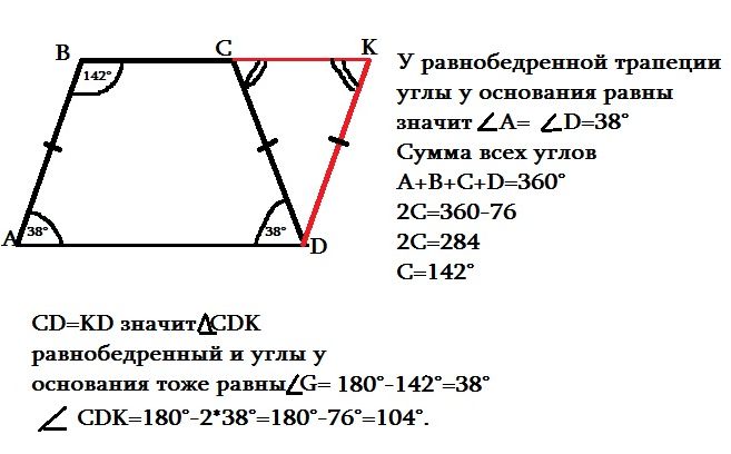 Угол А равнобедренной трапеции ABCD равен 38 градусов. Из точки D проведена прямая которая пересекает прямую ВС в точке К, и СD=DK. Найдите угол CDK. Ответ дайте в градусах.