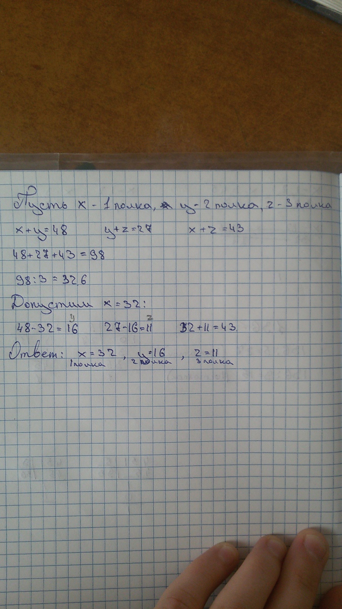 на первой и второй полке 48 книг,на второй и третьей 27 книг,а на первой и третьей 43 книги .Сколько книг на трёх полках?
