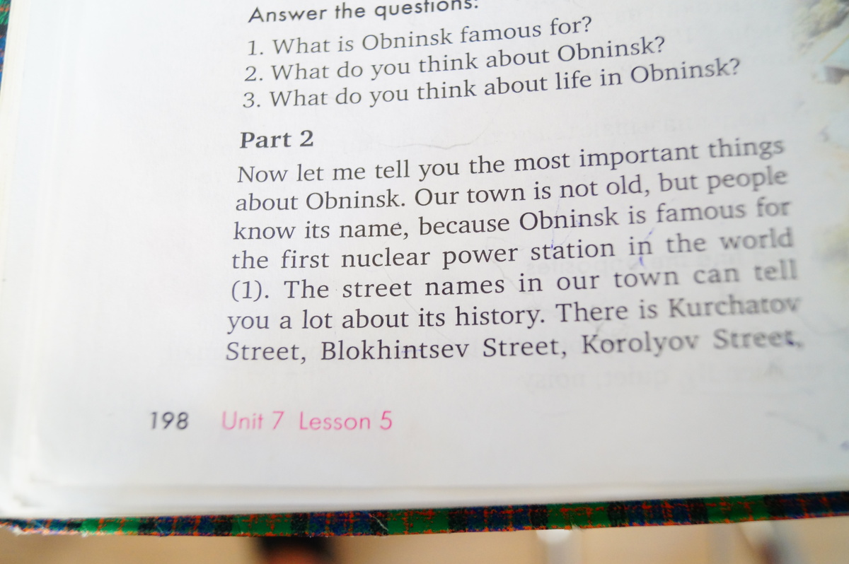 Теперь позвольте мне сказать о важных вещах про Обнинск. Наш город не старый, но люди знают про этот город, потому что Обнинск известен первым АЭС в мире. Имена улиц в нашем городе могут рассказать много чего про эту историю. Здесь улица Курчатова, улица Блошкинтсева, улица Королева.