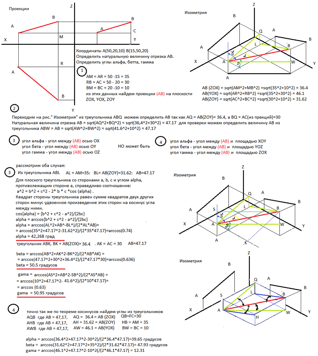 Даны координаты A(50,20,10) B(15,50,20) Определить натуральную величину отрезка AB. Определить углы альфа, бетта, гамма