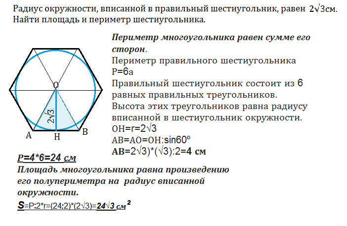 Радиус окружности, вписанной в правильный шестиугольник, равен 2√ 3 см. Найти площадь и периметр шестиугольника.