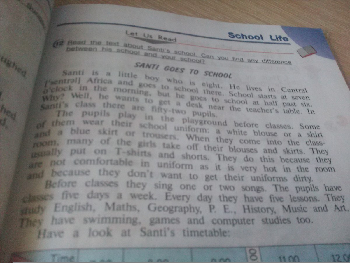 Школа Santi является SANTI Goes To scrroot маленького мальчика, который и идет он живет в Центральной там. Marts в семь хорошо, он хочет, но он беды в школу ITT половину пункта Класс есть получить стол стол в T. В являются их ученики играют на детской площадке перед занятиями. Некоторые изнашивают их школьная форма белый bloute голень синяя юбка или trosilien. Когда они приходят в клас. м, многие девушки снимают и юбки. Они не в и шорты. Они делают это потому, что они, потому что равномерная как очень в они не хотят, чтобы получить свою форму перед занятиями они поют одну или две песни. Ученики имеют классы дней в неделю. день у них есть пять уроков, они изучают английский язык, математику, географию, P Е., история, музыка и Ан есть бассейны, игры и компьютерные исследования тоже. пр взглянуть на график Санти: 12