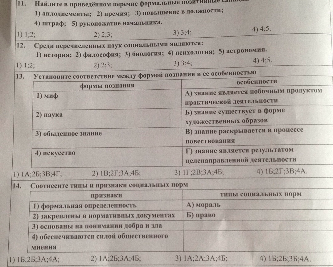 11. Найдите в приведенном перечне формальные позитивные санкции1) аплодисменты 2) премия 3) повышение в должности 4) Штраф 5) рукопожатие начальника 12. Среди перечисленных наук социальными являются 1) история 2) философия 3) биология 4) психология 5) астрономия 13- “ Установите соответствие между формой познания и ее особенностью ц формы познания Мыши 1) миф знание является побочным практической деятельности 77 Й 7 знание существует в фаре художественных обрезов Н 3) обыденное знание знание раскрывается в процессе 7 4) знание является результатом целенаправленной деятельности 1) 2) 3) 4) 14. Соотнесите типы и признаки социальных норм А признаки типы норм определенность мораль 7 ‘ 2) закреплены в нормативных документах право ‘ Бананы на понимании добра и зли ’ 4) общественного " ' мнения _ 1) 2) 3) 4)