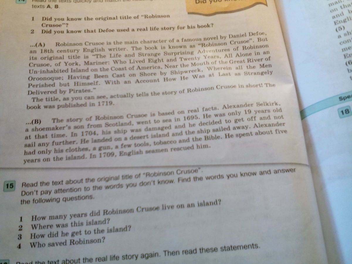 1) He lived on an island twenty-eight years.2)The island is located on the Coast of America, near the mouth of the great river of Oroonoque.3) He was having been cast on shore by shipwreck 4)-Там кто спас Робинзона,в тексте не нашла.