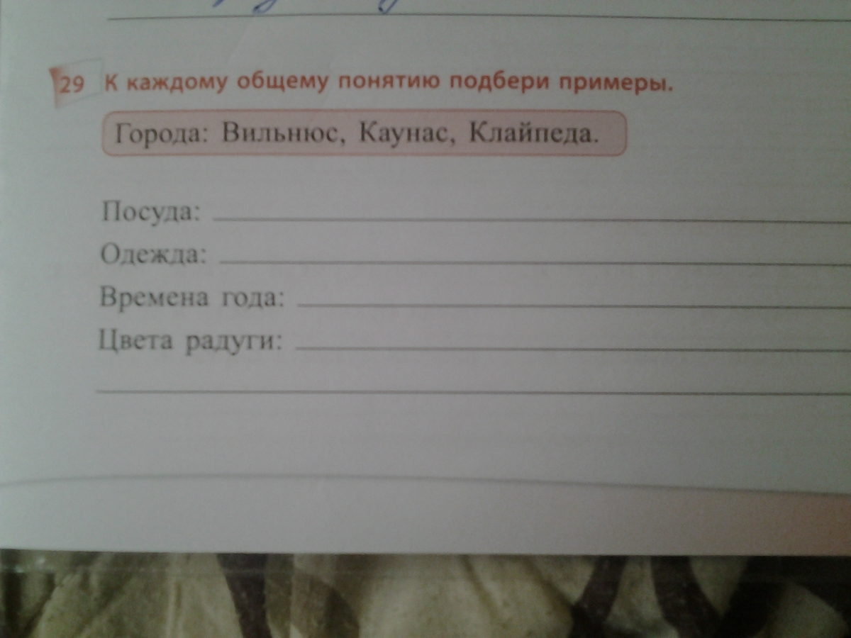 посуда:чашка,кастрюля,сковорода, тарелка, одежда: майка,футболка,штаны , времена года: зима,весна , лето, осень , цвета радуги:красные , оранжевый , жёлтый , зелёный , синий,фиолетовый