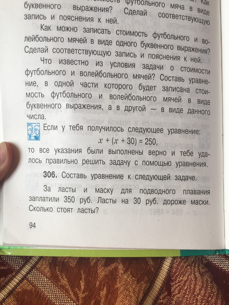 пусть маска стоит х руб, тогда ласты-(х+30)руб. Всего они стоят (х+х+30), что по условию равно 350. составим и решим уравнение
