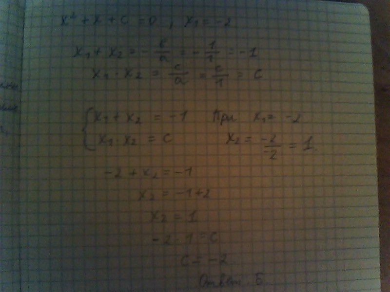 5) Один из корней уравнения х2+х+c = 0 равен -2 . Найдите коэффициент с и другой корень уравнения