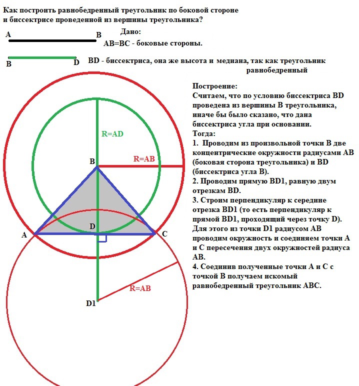 Как построить равнобедренный треугольник по боковой стороне и биссектрисе проведенной из вершины треугольника?