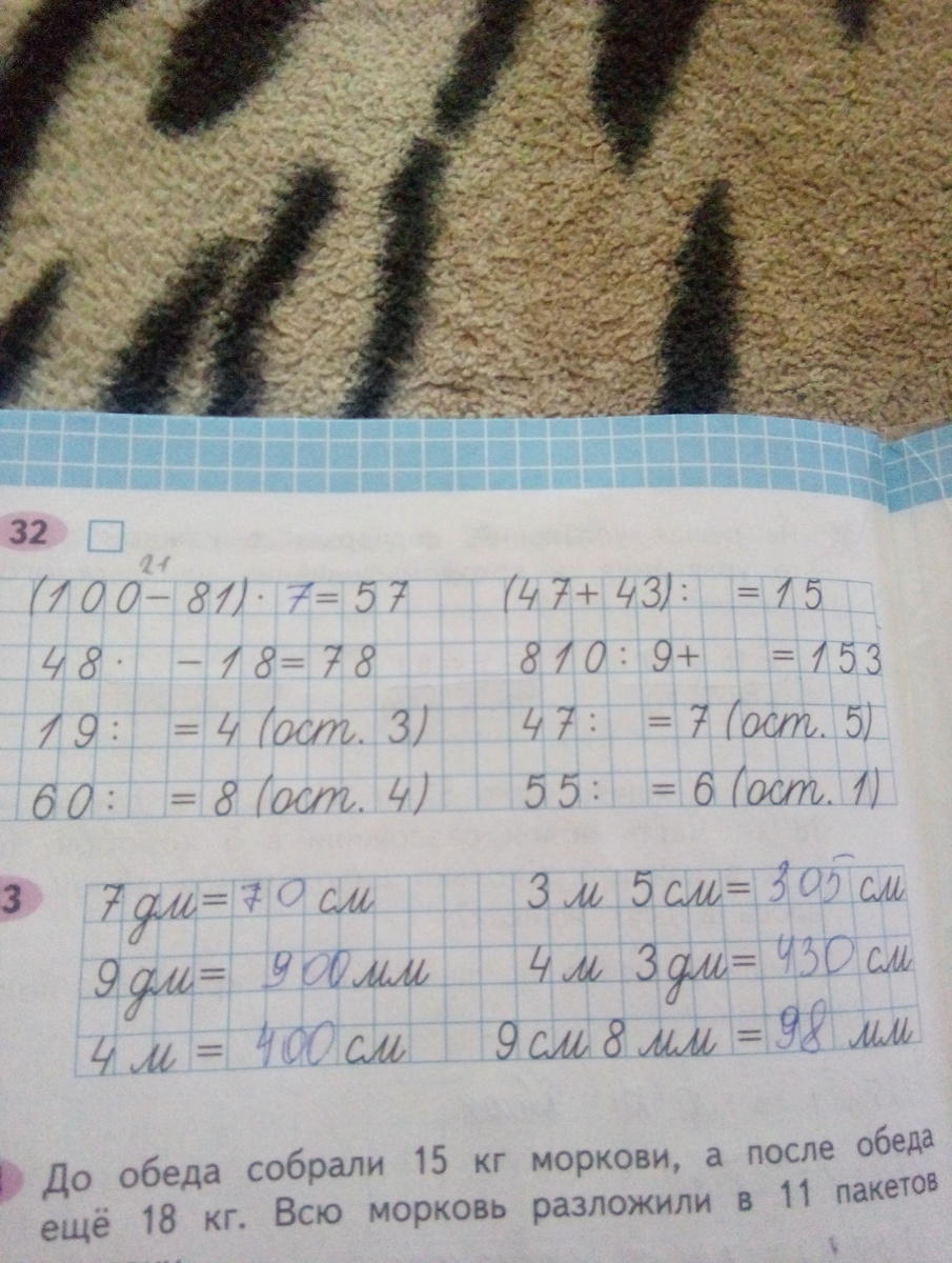100-81(19)•3=57 48•2-18=78 19:4=4(ост.3). 60:7=8(ост.4) (47+43):6=15 810:9+63=153 47:6=7(ост.5) 55:9=6(ост.1) Пожалуйста)