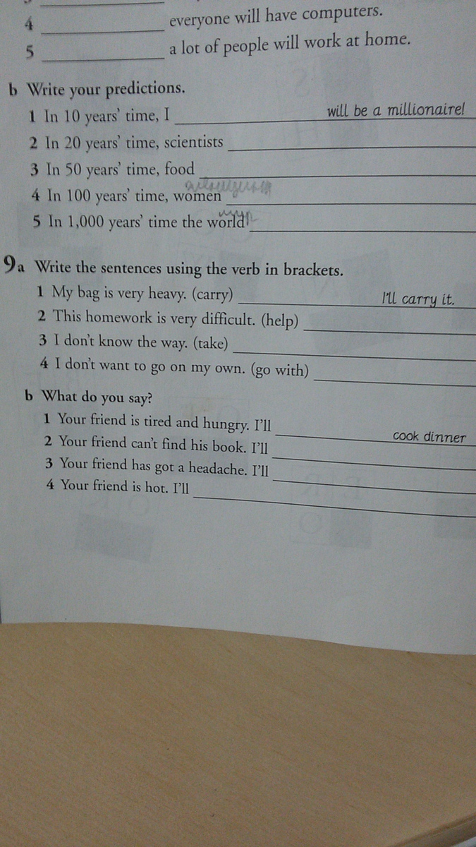 а) 2) Help me. 3) Take me there. 4) Do you want to go with me? b) 2) i'll find this book 3)I'll help him/I'll give him a pill 4)I'll open the window