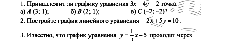 Для того, чтобы узнать, принадлежит ли точка графику, необходимо в уравнение данной прямой подставить координаты - написать вместо х и у числа. Если выражения справа и слева от знака равно тождественны, то точка графику принадлежит.