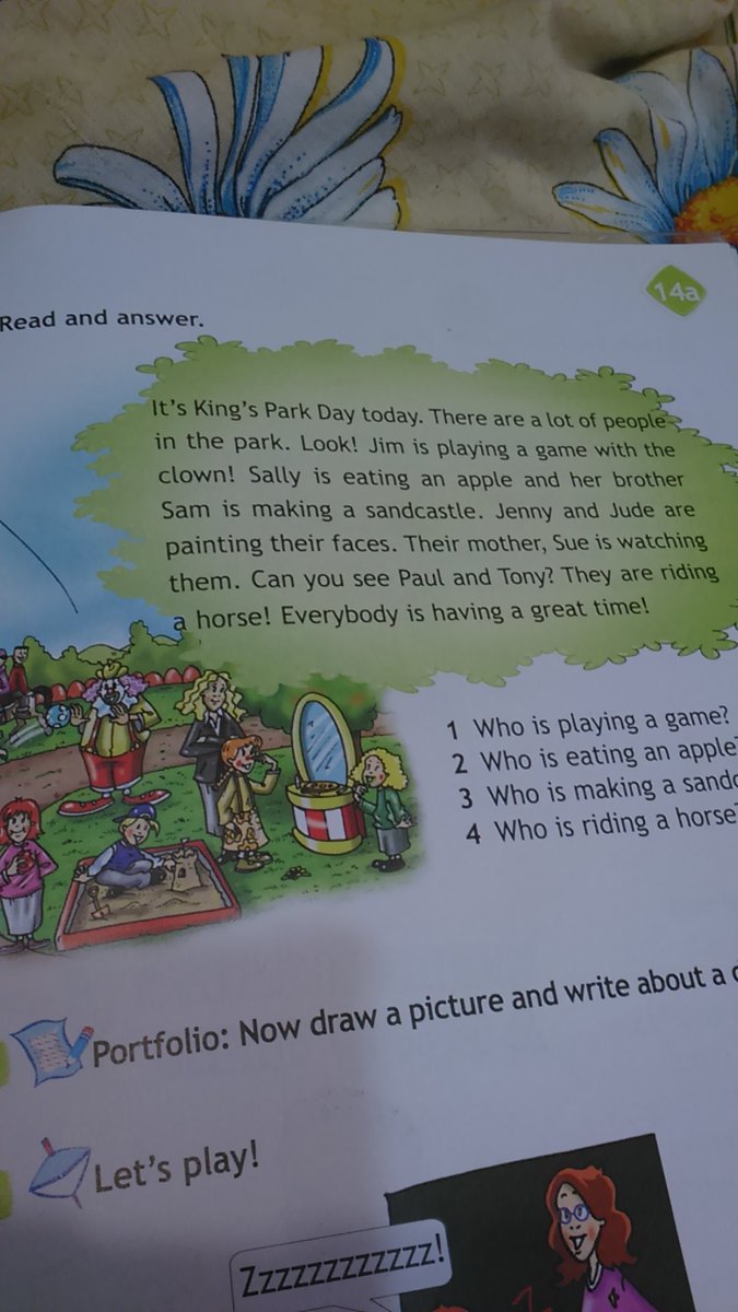 Сегодня день королевского парка. В парке очень много народа. Джим играет в игру с Клоуном. Салли ест яблоко а её брат строит замок. Дженни и Джуд разрисовывают свои лица. их мама сью ждёт их. Ты можешь увидеть пауло и тони? Они катаются на лошади. Все отлично проводят время