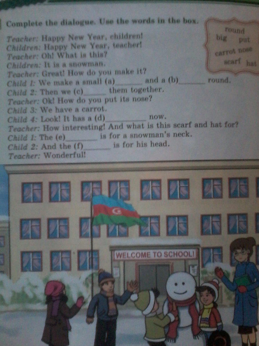 а) round, b) big, c) put d) nose e) scarf , f) hat