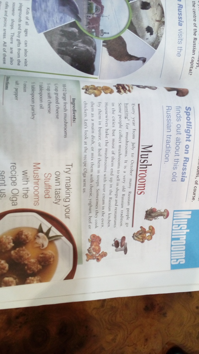 каждый год с июля по сентябрь многие русские люди ходят на охоту за грибами. Это очень старая традиция. Некоторые собирают грибы для того чтобы продать их в рестораны и магазины, но в основном они заканчивают на русских кухнях. Домохозяйки запекают грибы со сметаной в духовке, жарят в масле, или варят в супах. Иногда они готовят их как основное блюдо, иногда смешивают с сыром, йогуртом, говядиной или курицей. Давайте посмотрим на рецепты, которые Ольга нам прислала.