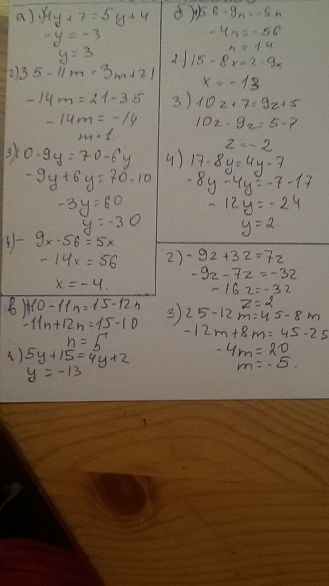 а) 4у + 7 = 5у +4 35 - 11m = 3m + 21 10 - 9y = 70 - 6y -9x - 56 = 5x б) 56 - 9n = -5n 15 - 8x = 2 - 9x 10z +7 = 9z + 5 17 - 8y = 4y-7 в) 10 - 11n = 15 -12n -9z + 32 = 7z 25 - 12m = 45 - 8m 5y + 15 = 4y + 20
