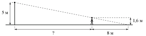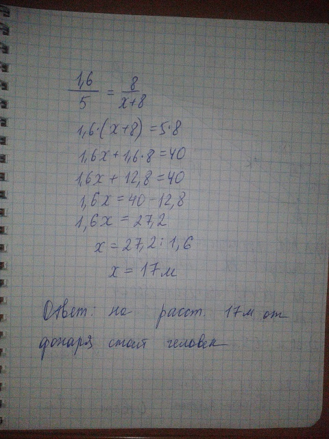 На каком расстоянии (в метрах) от фонаря стоит человек ростом 1.6 м, если длина его тени равна 8 м, а высота фонаря 5 м?