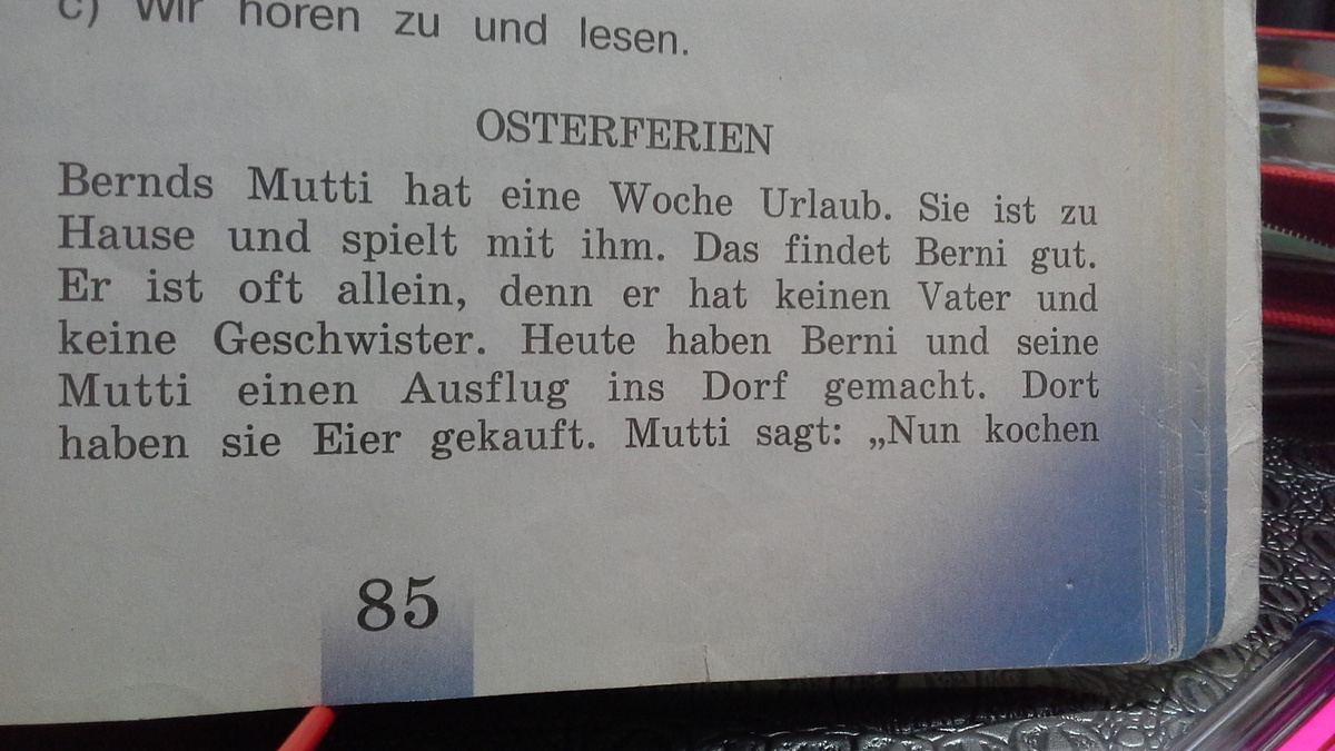 Мама Бернда в отпуске целую неделю. Она дома и играет с ним. Это очень нравится Берни. Он часто остается один, так как у него нет ни отца, ни братьев и сестер. Сегодня Берни с мамой ездили в деревню. Там они купили яйца. Мама говорит: "Ну, давай приготовим..."