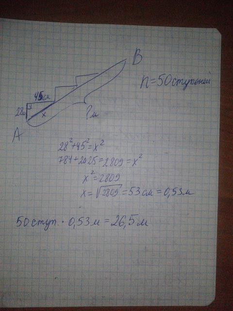 лестница соединяет точки А и В и состоит из 50 ступеней. Высота каждой ступени равна 28 см. , а длина 45 см Найдите расстояние между точками А и В (в метрах)