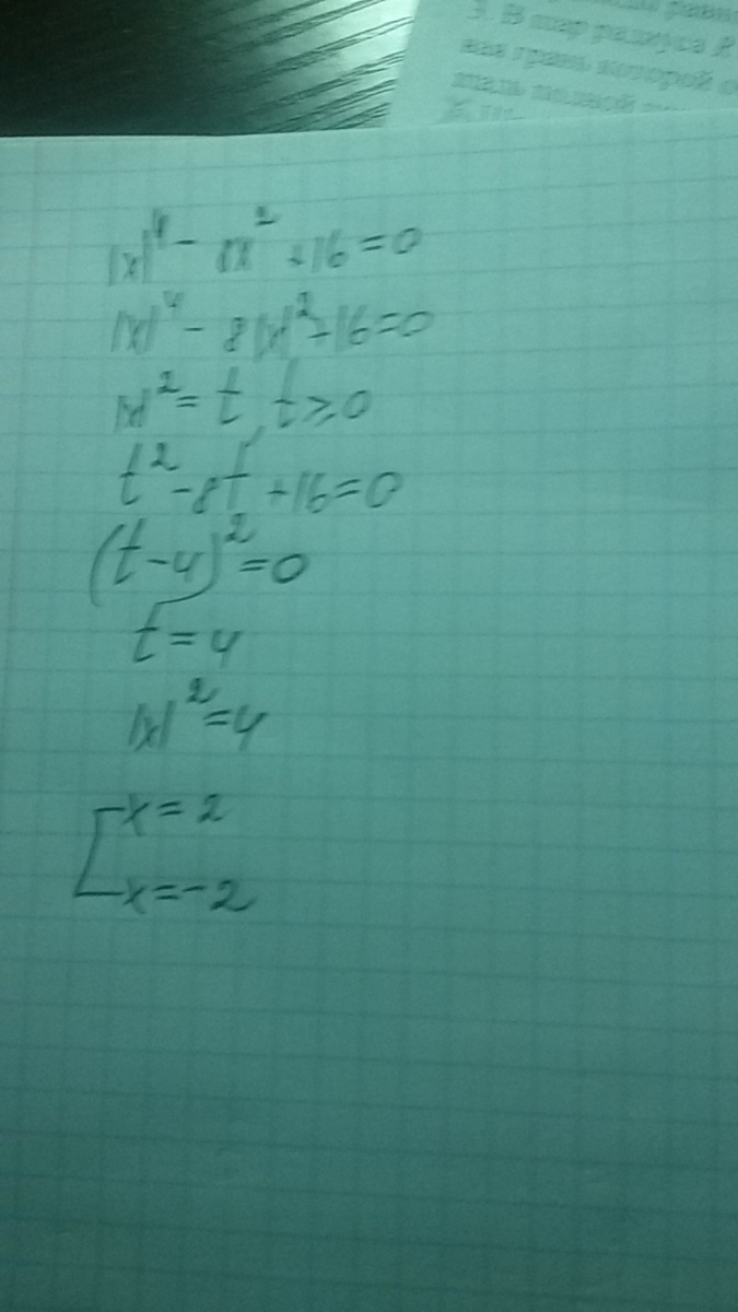 8x берешь в модуль, а потом делаешь замену на модуль икс квадрат равно t, t больше либо равно нуля (по определению модуля)