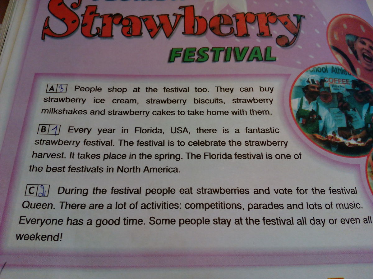 В) Каждый год в Флориде, США, проходит фантастический клубничный фестиваль. Фестиваль отмечает сбор урожая клубники. Это происходит весной. Флоридский фестиваль один из лучших в Северной Америке.