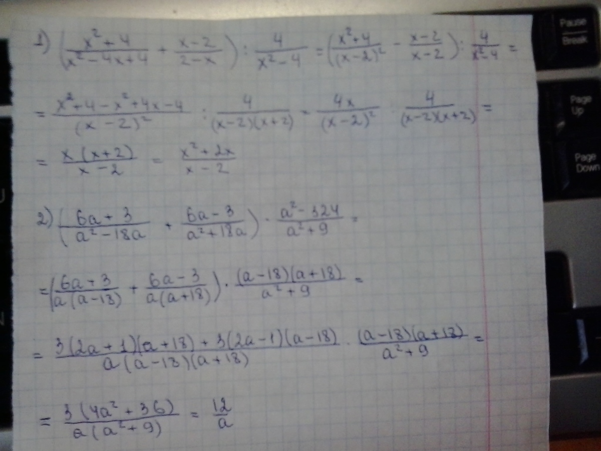 1) (x^2 + 4 /(дробная черта) x^2 - 4x + 4 (<--первая дробь) + x - 2 /(дробная черта) 2 - x (<--вторая дробь) ) /(деление на скобку) 4 /(дробная черта) x^2 - 4