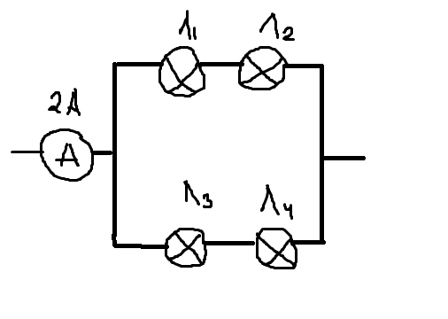 Определите мощность,потребляемую лампой Л4, если ее сопротивление равно 4 Ом, сопротивление лампы Л1 равно 1 Ом, лампы Л2- 2 Ом, лампы Л3 - 2 Ом