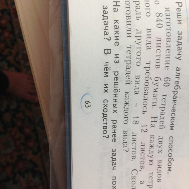 Эту задачу необходимо решить алгебраическим способом. Алгебраический способ - это способ решения задач уравнением. На изготовление 60 тетрадей двух видов пошло 840 листов бумаги. На каждую тетрадь одного вида требовалось 12 листов, а на тетрадь другого вида - 18 листов. Сколько изготовили тетрадей каждого вида? помогите пожалуйста!