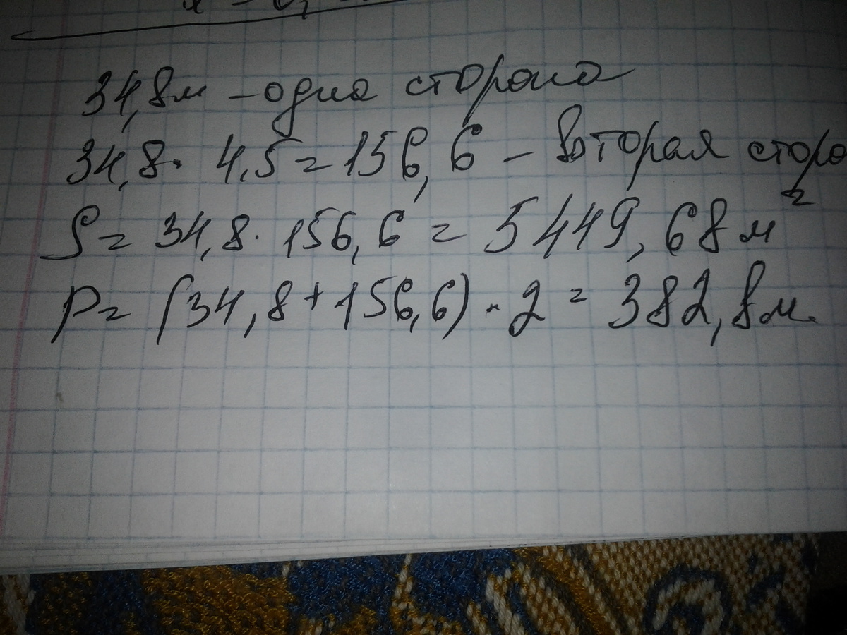 Одна сторона прямоугольника - 34,8м, а другая - в 4,5 раза длиннее. Вычисли площадь и периметр прямоугольника