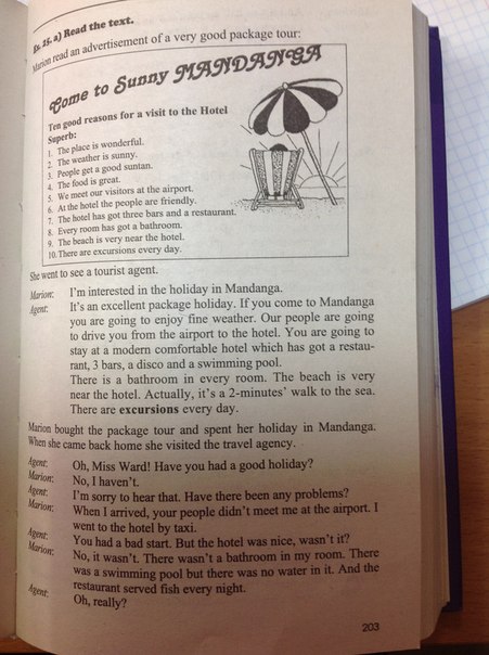 Агент:это прекрасная путевка. Если вы поедете в Мандангу,вы восхититесь чудесной погодой. Наши люди привезут вас из аэропорта в отель. Вы остановитесь в современном удобном отеле,в котором есть ресторан,3 бара, проводятся дискотеки и бассейн. В каждой комнате есть ванная комната. Пляж находится рядом с отелем. Често говоря,до моря всего 2 минуты ходьбы. Каждый день проводятся экскурсии. Мэрион купила путевку и провела отпуск в Мандангу. Когда она возвратилась домой, она зашла в турагенство.