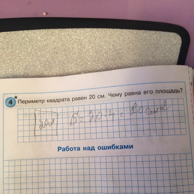 периметр это сумма длин всех сторон, значит если P=20, то одна строна равна 5 , и площадь это a×a т.е. 5×5=25 см^2