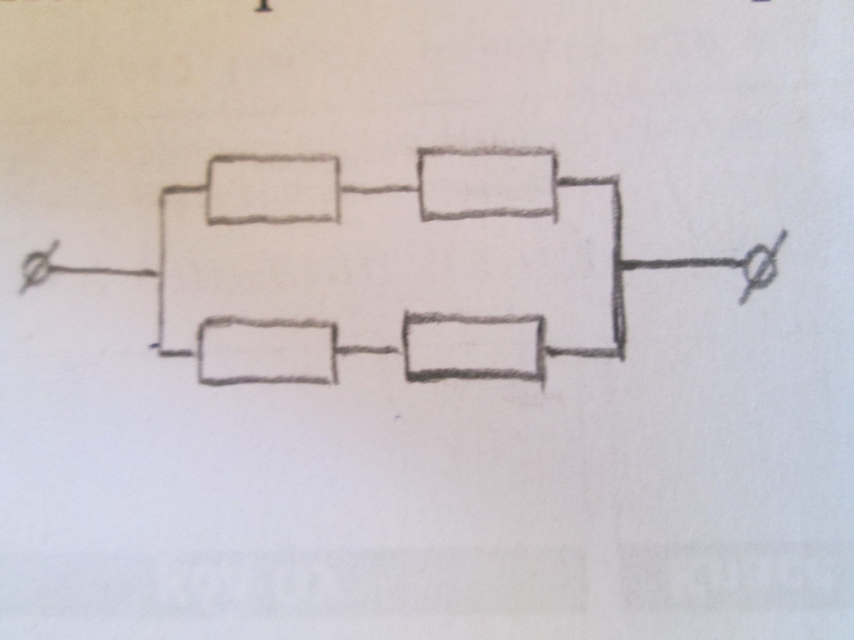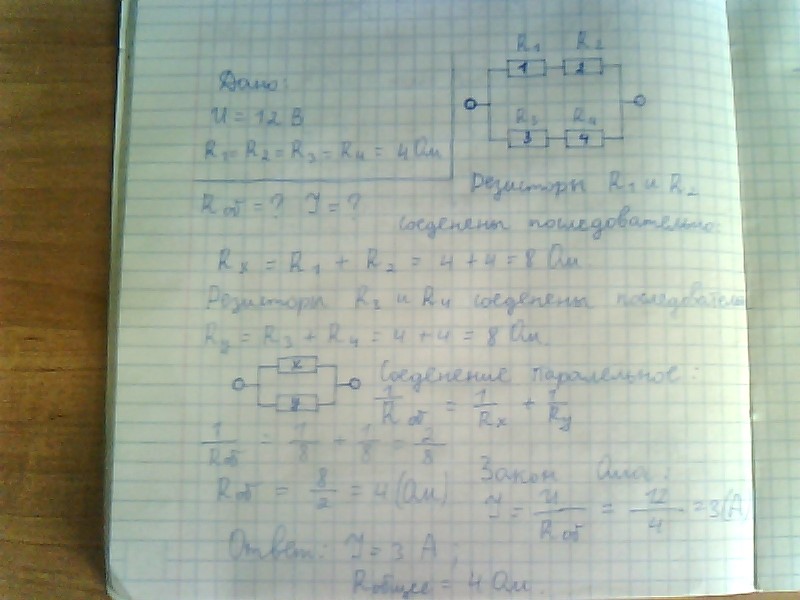 На рисунке изображено соединение четырех одинаковых сопротивлений, каждое из которых равно 4 Ом. Напряжение на клеммах равно 12 В. Определите общее сопротивление и силу тока.