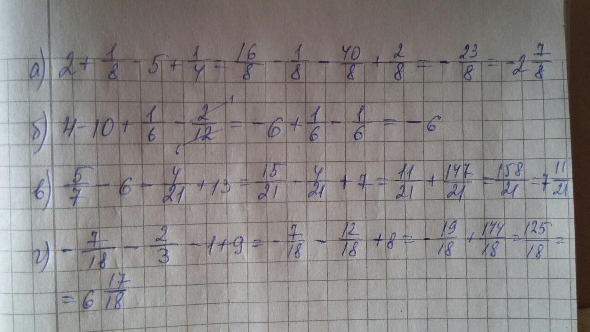 Найдите значение выражения: а) 2+1/8-5+1/4 б) 4-10+1/6-2/12 в) 57-6-4/21+13 г) -7/18-2/3-1+9 Заранее спасибо